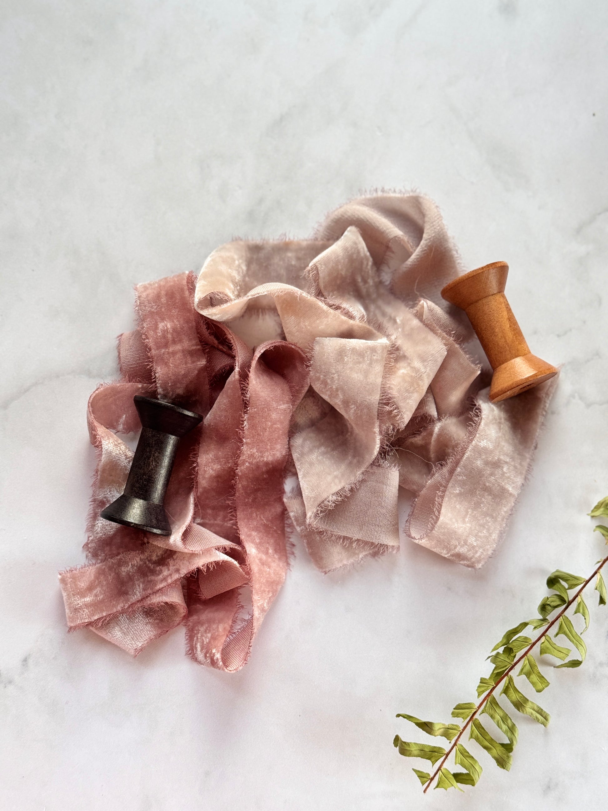 Conoce nuestros listones de Terciopelo de Seda: Suavidad mantecosa que derretirá los corazones más fríos. Es nuestra listón de mayor peso, mezclada con rayón para una textura sensual. ¿Nuestra promesa? Colores suaves y románticos, pero los hacen lujosos gracias a un brillo aterciopelado en un lado y bordes crudos deshilachados a mano.